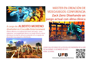 El próximo viernes 15 de marzo a las 16 horas, dentro del marco del máster de Creación de Videojuegos de la UAB, Alberto Moreno nos presentará la conferencia "Zack Zero: Diseñando un juego actual con alma clásica".